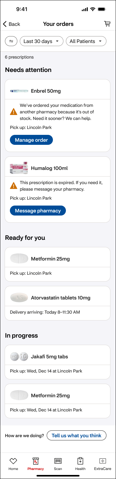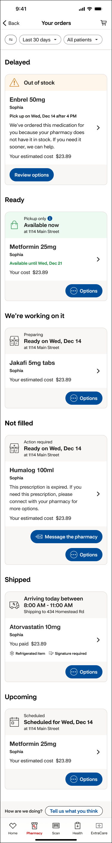 User testing showed the existing design was confusing, so I focused on making order status easier to scan and understand. With CVS filling over 4 million prescriptions a day, even small clarity improvements can help millions of people.