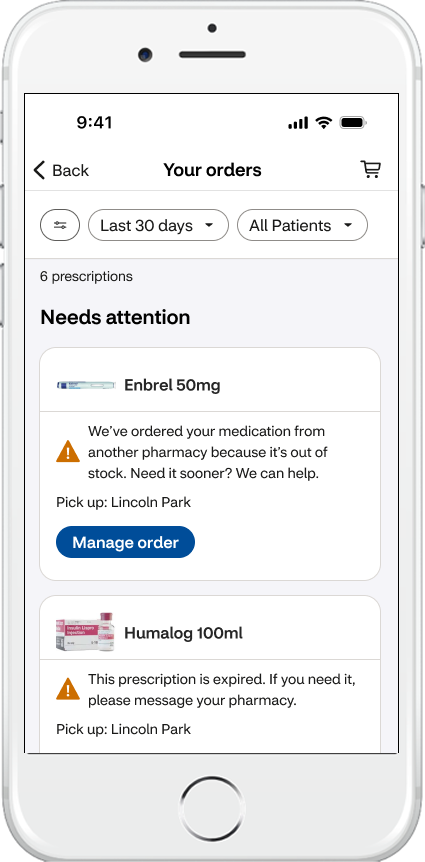 I then rebuilt the prescription cards using scalable design system components and redesigned all 21 order-state scenarios, so the screen supports faster scanning, clearer decisions, and smoother follow-through. Below are six examples.