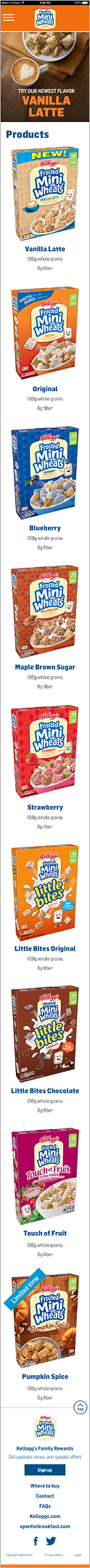 This page showcases all nine Frosted Mini-Wheats products, with a banner highlighting the newest item.